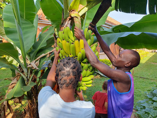 Juhuu - unsere ersten Bananen sind reif und müssen geerntet werden.
